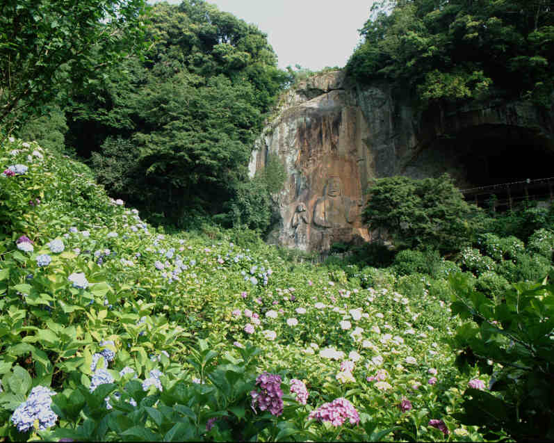 木々の緑とあじさいにかこまれた磨崖仏